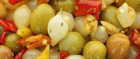 Olives, eau, sel, oignons, poivrons (sulfites), piments (sulfites), cumin, menthe, huile de colza, arôme naturel de cumin et d’ail, acidifiant : acide lactique, antioxydant : acide ascorbique, conservateur : sorbate de potassium.