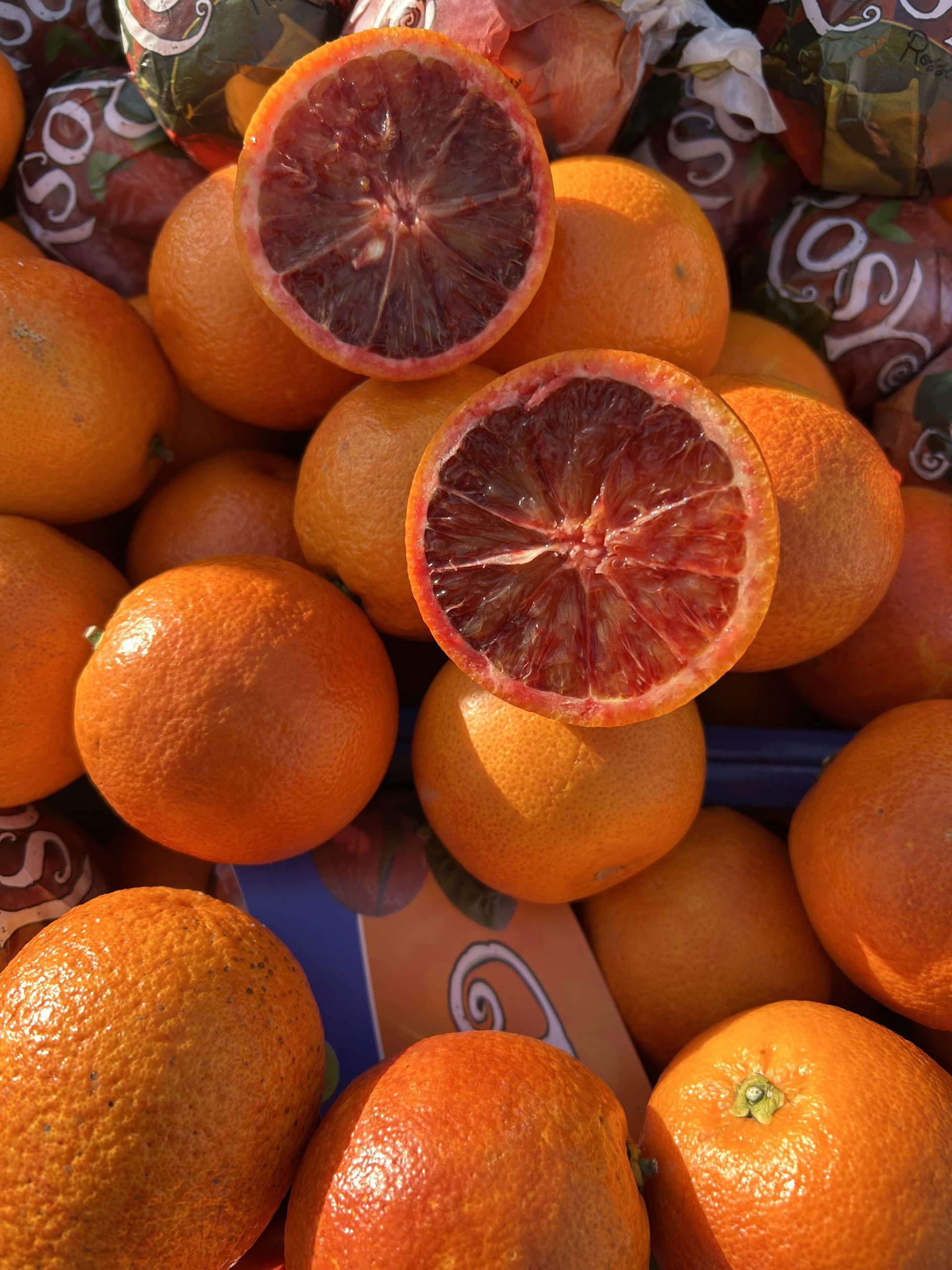 L’orange Tarocco est une variété d’orange sanguine originaire d’Italie, connue pour sa chair juteuse, sucrée et légèrement acidulée. Sa coloration rouge-orangée varie selon les conditions climatiques. Elle est appréciée aussi bien en consommation fraîche qu’en jus, grâce à son goût équilibré et parfumé.