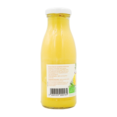 Jus d’orange*, purée de banane*, purée de mangue*, lait de coco*(pulpe de noix de coco*, eau), jus de fruit de la passion.